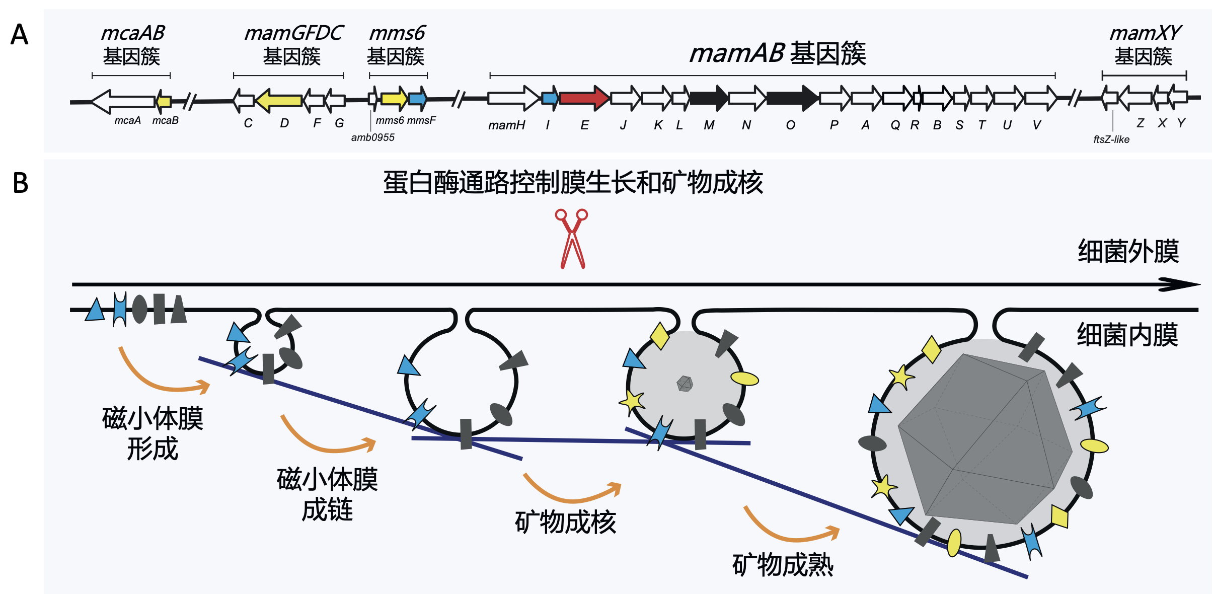 图2 模式趋磁细菌AMB-1中磁小体矿化机制。(A) AMB-1中参与磁小体矿化的五个关键基因簇。(B) 磁小体合成的不同步骤。蓝色和黄色表示不同蛋白质在不同阶段靶向到合成磁小体的细胞内膜上,红色表示MamE蛋白酶介导控制磁小体膜生长和矿物成核的调控通路
