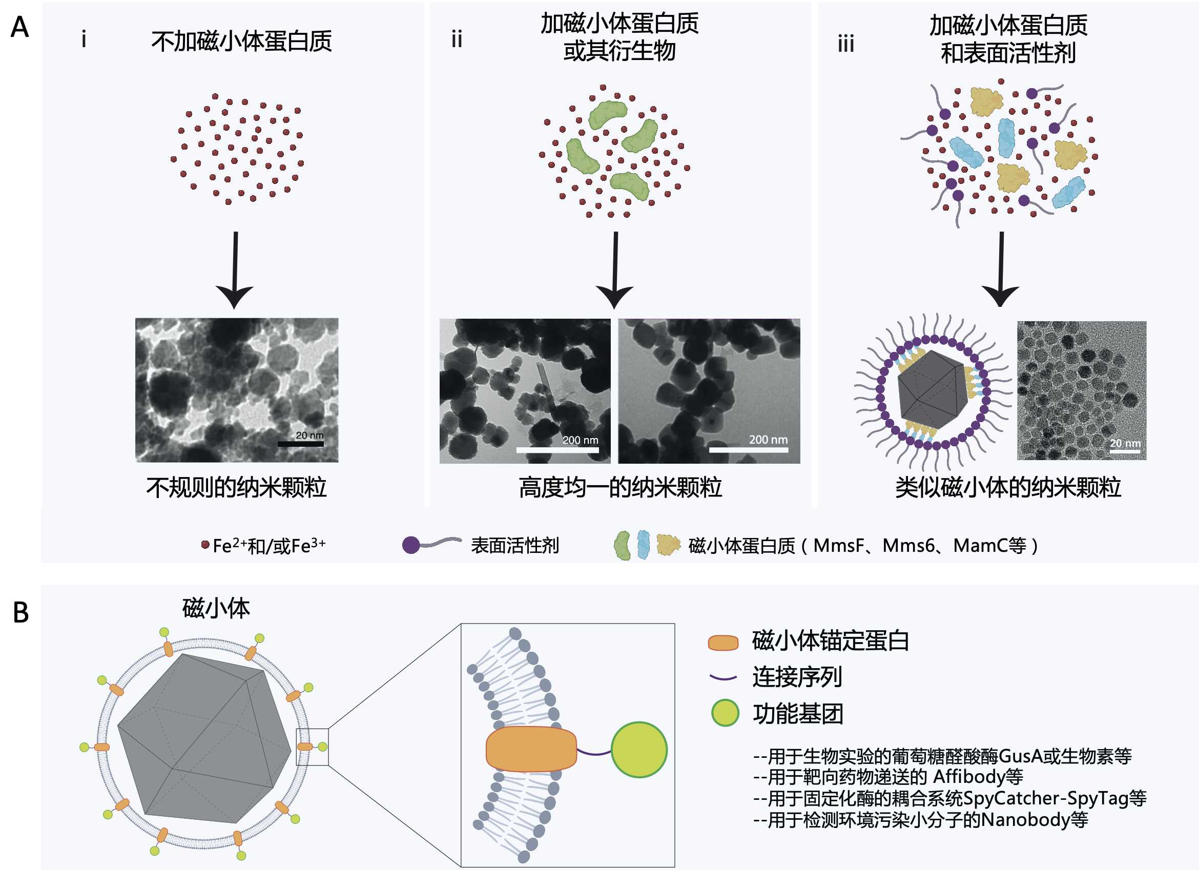 图3 磁小体的应用。(A)三种不同磁性纳米颗粒体外合成的策略:不添加磁小体蛋白(A-i)、仅添加磁小体蛋白(A-ii)以及同时添加磁小体蛋白与表面活性剂(A-iii)。(B) 通过对磁小体锚定蛋白进行遗传修饰,将特定功能基团连接到磁小体表面,实现磁小体在不同领域的应用