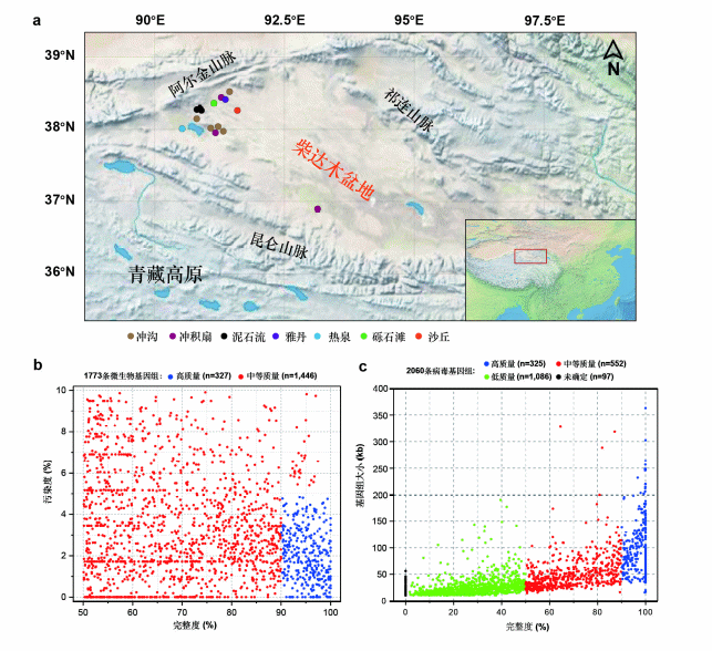 图2 柴达木盆地微生物基因组数据库。a.柴达木盆地采样地点类型与位置;b.1773条细菌和古菌基因组质量情况;c.2060条病毒基因组质量情况