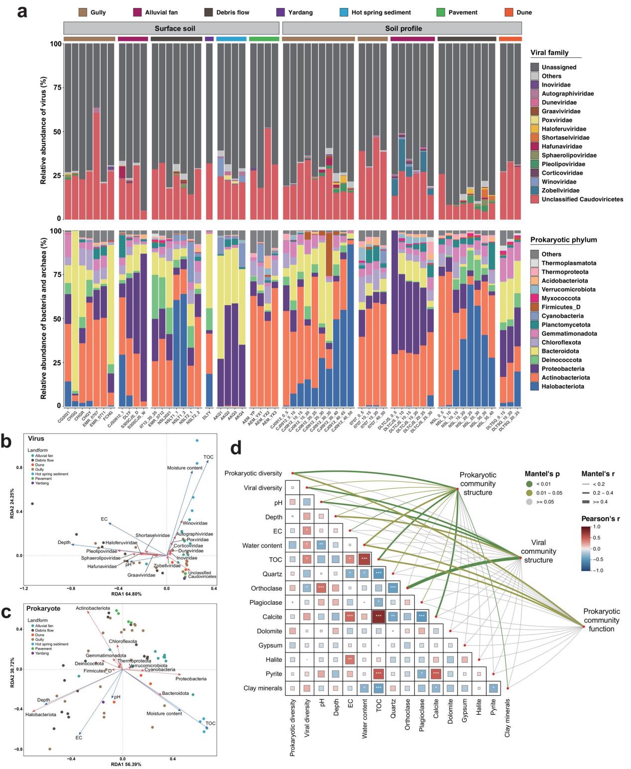 中国科学院地质与地球物理研究所行星科学与前沿技术重点实验室的刘立博士后与合作导师林巍研究员等,系统采集了柴达木盆地代表性类火星地貌和不同深度的土壤样品,利用宏基因组学技术,成功获得了1773条细菌和古菌基因组以及2060条病毒基因组,并构建了柴达木盆地类火星环境微生物基因组资源数据库(图2)。在此基础上,结合土壤理化性质、矿物组成等地质环境信息,系统研究了柴达木盆地不同地貌类型和土壤深度中微生物的多样性、分布特征、生存策略及其相互作用关系。