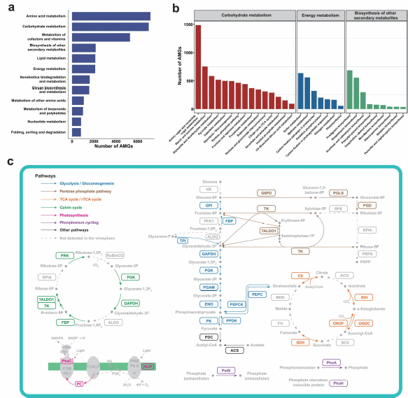 图4 病毒宿主预测和辅助代谢基因鉴定。a.病毒-宿主关系预测结果;b.广宿主病毒筛选;c.涉及生物地球化学循环通路的病毒辅助代谢基因鉴定