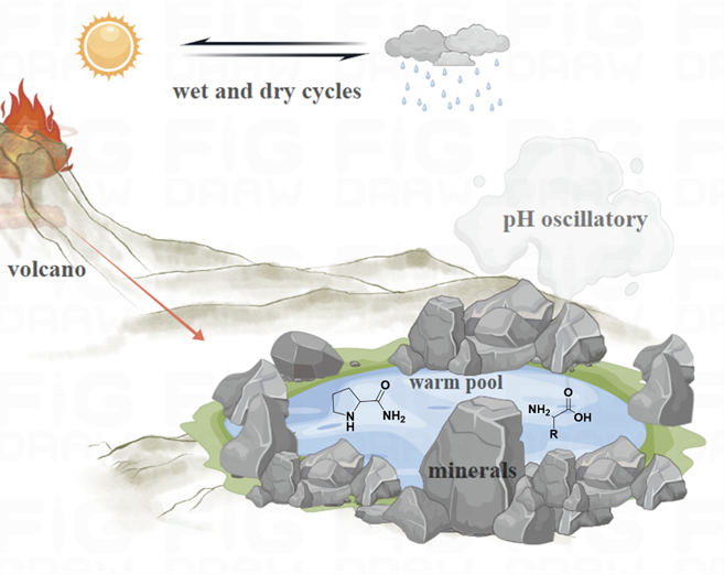 早期火山附近的小水池被认为是生命起源的理想场所,然而小池子的pH振荡机制对于生物分子聚合的作用一直被低估了。本文通过模拟“温暖的小池塘”,证明了pH振荡环境提供了一种有效的、新颖的途径,对于脯氨酸酰胺和游离氨基酸形成环二肽有显著影响。令人惊喜的是,通过脯氨酸酰胺合成环二肽的过程无需任何催化剂。进一步的研究表明,早期地球表面的活化剂P3m、黏土矿物(蒙脱土、方解石、磁铁矿)、金属离子(Ca2+、Mg2+)等在该过程中起到了重要的作用。总之,本研究为前生命肽的合成提供了一条可行的途径,并提出了生命起源理想场所下的pH振荡模型(图1)。