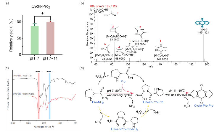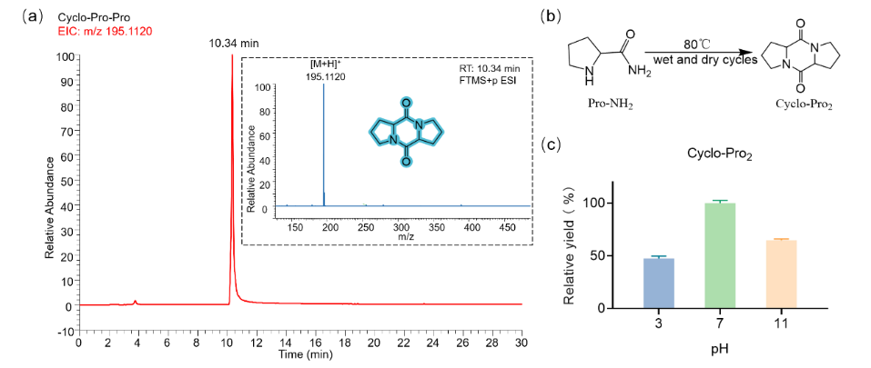 为了探究这一问题,我们使用 Ala-NH2 进行了成肽反应,该反应产物主要为线性肽,以验证缩合反应的最佳pH为7。推测在前生命环境条件的多变性,尤其是pH值的变化,更有利于使用Pro-NH2作为构建单元通过单组分反应生成cyclo-Pro-Pro。为了验证这一假设,我们设计了以下实验。在初步实验的基础上,我们设计了一项研究来探究pH值的变化情况。从Pro-NH2合成出cyclo-Pro-Pro的过程是在pH 7下开始的。反应物在 80℃的恒温环境下暴露于开放环境中,持续 24 小时。随后加入1 mL水,并使用2 M的NaOH溶液将 pH 值调整至11。该反应在pH值变化的情况下表现出更高的效率(图3)。