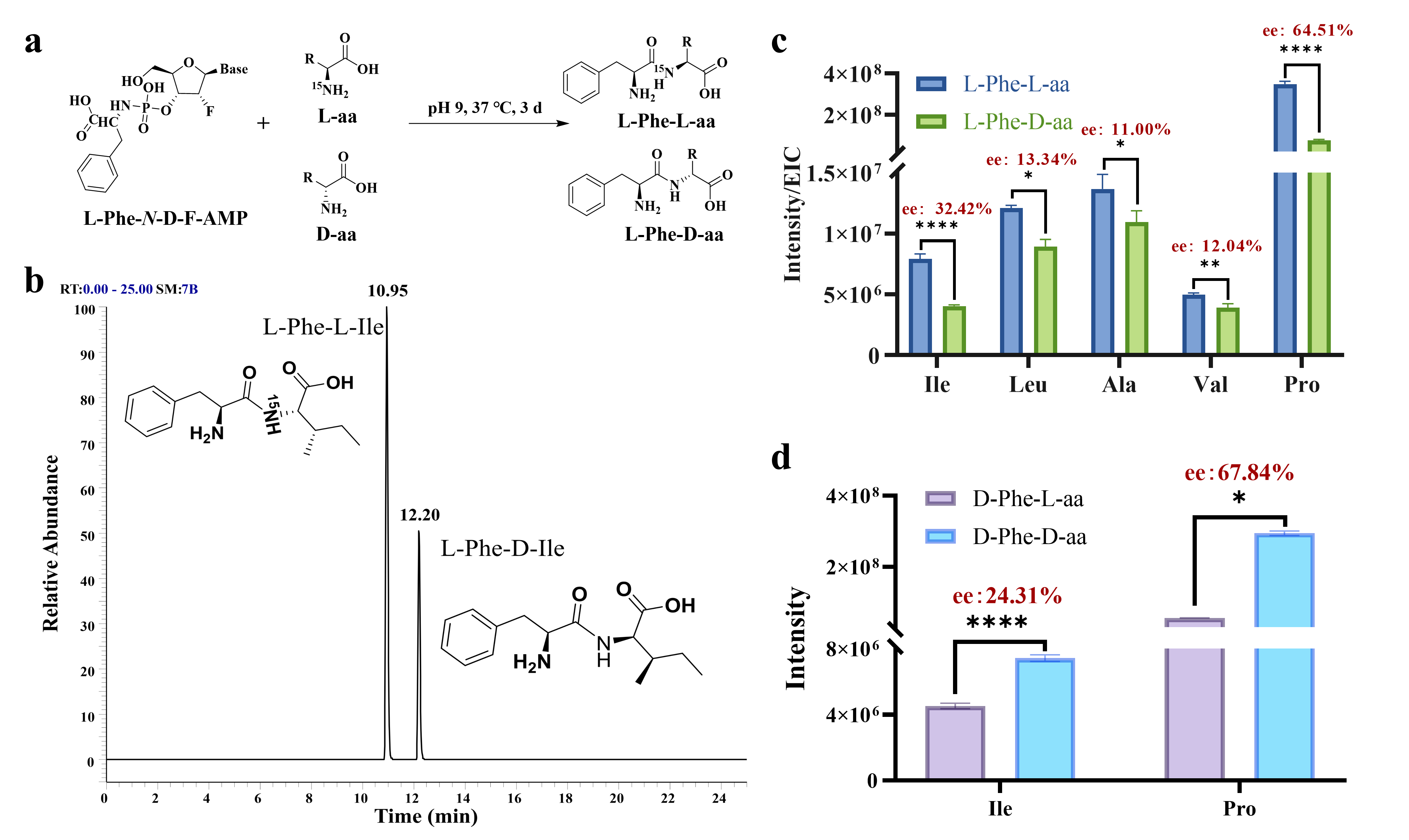 图2 (a)基于N-Phe-D-F-AMP合成不同的手性肽。(b)N-L-Phe-D-F-AMP与外消旋Ile反应产物的提取离子色谱图。(c) N-L-Phe-D-F-AMP与不同外消旋AA反应,产物中不同手性肽进行比较。(d) N-D-Phe-D-F-AMP与不同外消旋AA反应,产物中不同手性肽进行比较。****表示P值 < 0.0001,**表示P值 < 0.01,*表示P值 < 0.05。