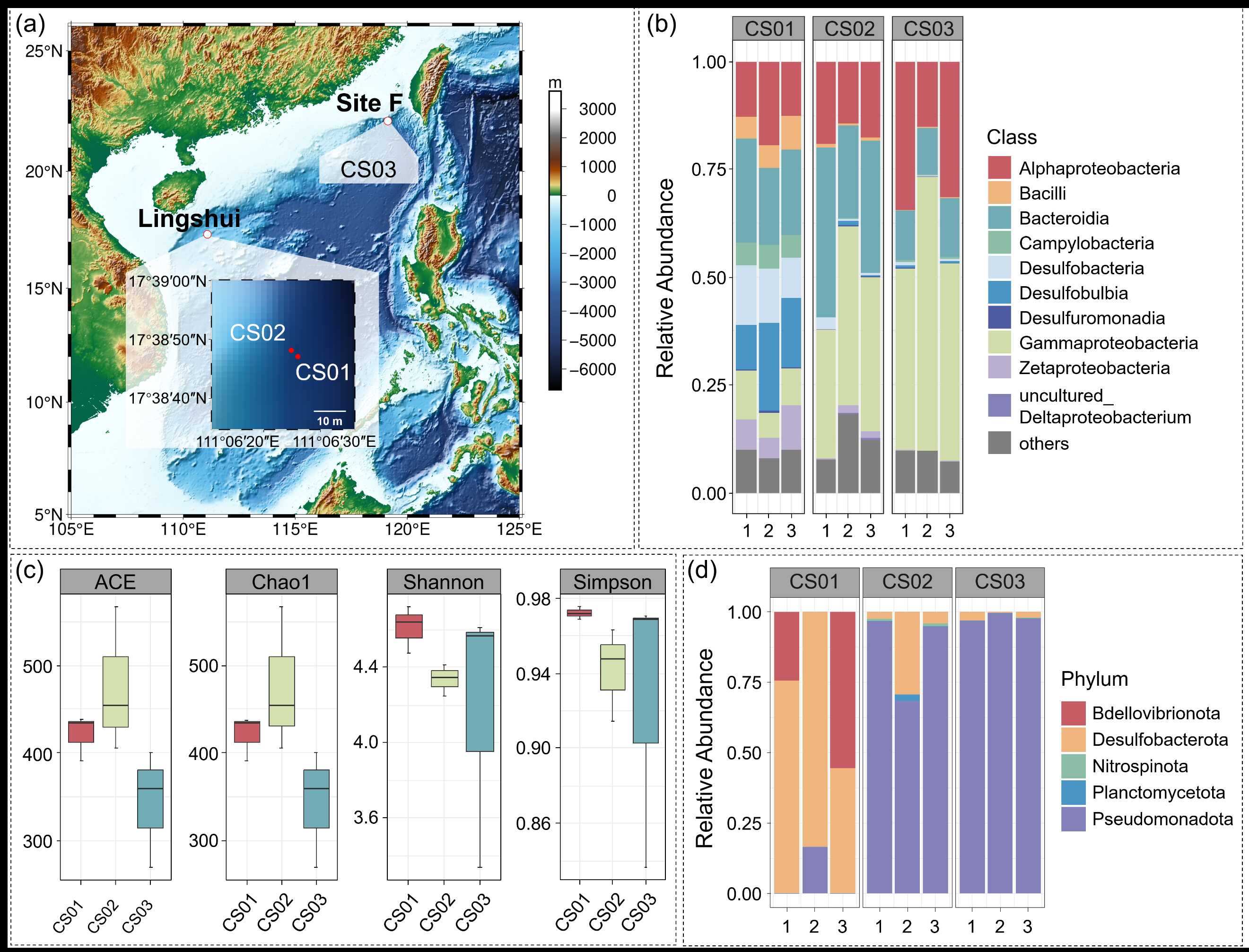 图1 南海冷泉沉积物细菌群落组成与多样性。(a) 研究区域及采样点位置(红点标注),CS01和CS02取自陵水冷泉,CS03取自福尔摩沙冷泉(Site F);(b) 各样品中优势菌纲(前10类)相对丰度,其余类群归为“其它”;(c) 3个样品的α多样性指数(ACE、Chao1、Shannon、Simpson)箱线图;(d) 趋磁细菌(MTB)扩增子序列在门水平的分类归属