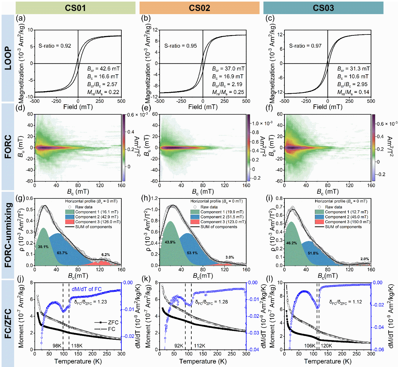 图2 南海冷泉沉积物(CS01-CS03)岩石磁学分析结果。(a-c)室温磁滞回线;(d-f)FORC图谱;(g-i)零背景场(Bu=0 mT)下矫顽力分布ρ(Bc)的三组分高斯分解:绿色(低矫顽力钛磁铁矿/等轴磁小体)、蓝色(中矫顽力高钛钛磁铁矿/棱柱-子弹头形磁小体)、红色(高矫顽力赤铁矿/针铁矿),白圈为原始数据,黑线为拟合曲线;(j-l)场冷(FC)与零场冷(ZFC)升温曲线(蓝线与白圈为FC曲线一阶导数),黑色虚线标示Verwey转变温度
