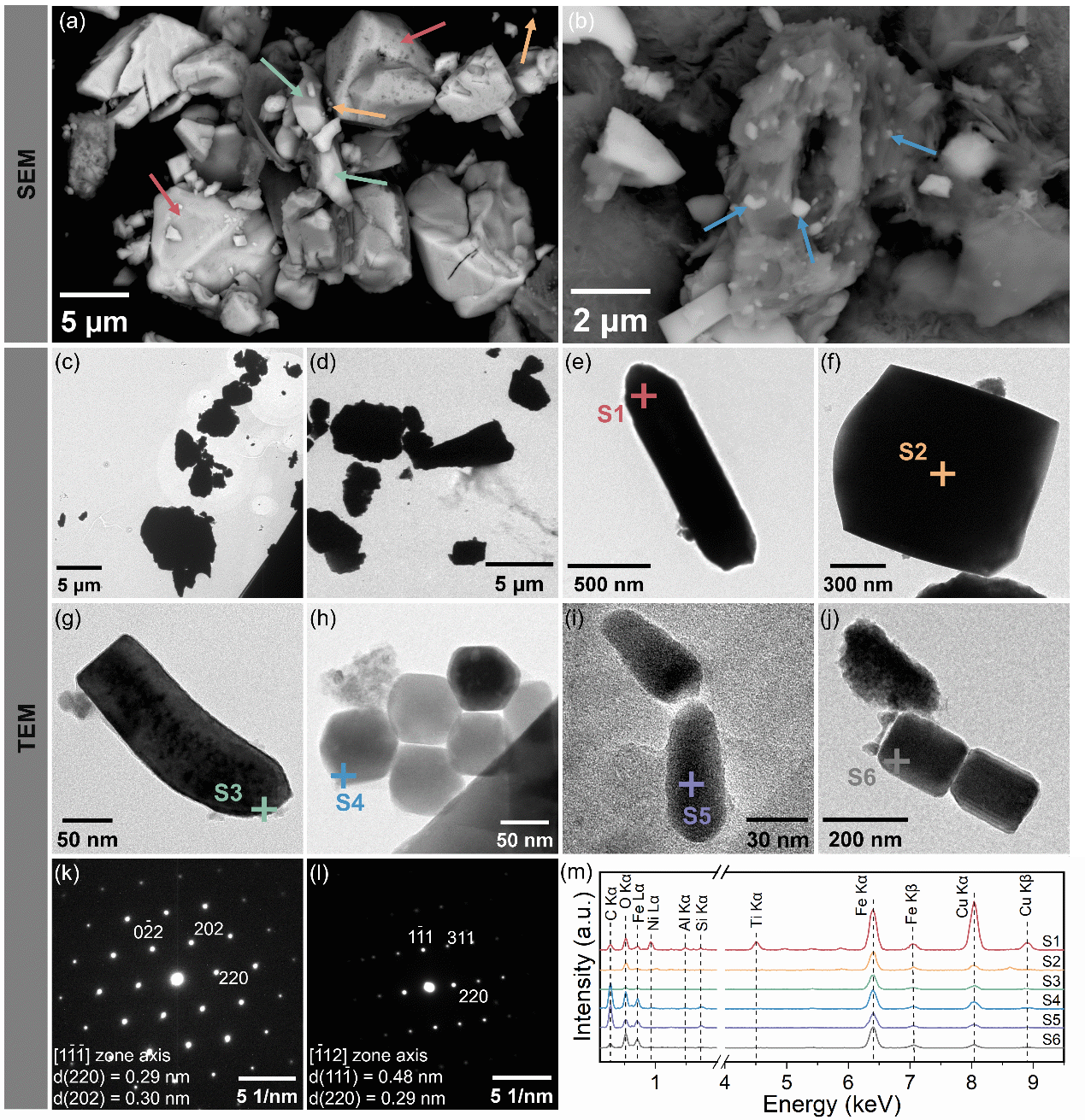 图3 南海冷泉沉积物磁性矿物的形貌与化学特征。(a-b) CS03和CS02样品的背散射电子图像,显示不同类型颗粒:绿色箭头-棱角状钛磁铁矿;红色箭头-八面体钛磁铁矿;橙色箭头-纳米级磁铁矿;蓝色箭头-硅酸盐包裹的磁铁矿包裹体。(c-f) CS02(c,d)、CS03(e)和CS01(f)样品的明场透射电镜图像,展示碎屑磁铁矿颗粒。(g-j) 四种典型磁小体形貌:(g)弯曲子弹头形(CS02)、(h)八面体形(CS02)、(i)子弹头形(CS02)、(j)长棱柱形(CS01)。(k,l) 对应(g,h)的选区电子衍射花样,证实磁铁矿晶体结构。(m) 各颗粒(标记于e-j)的能谱分析结果,显示其元素组成