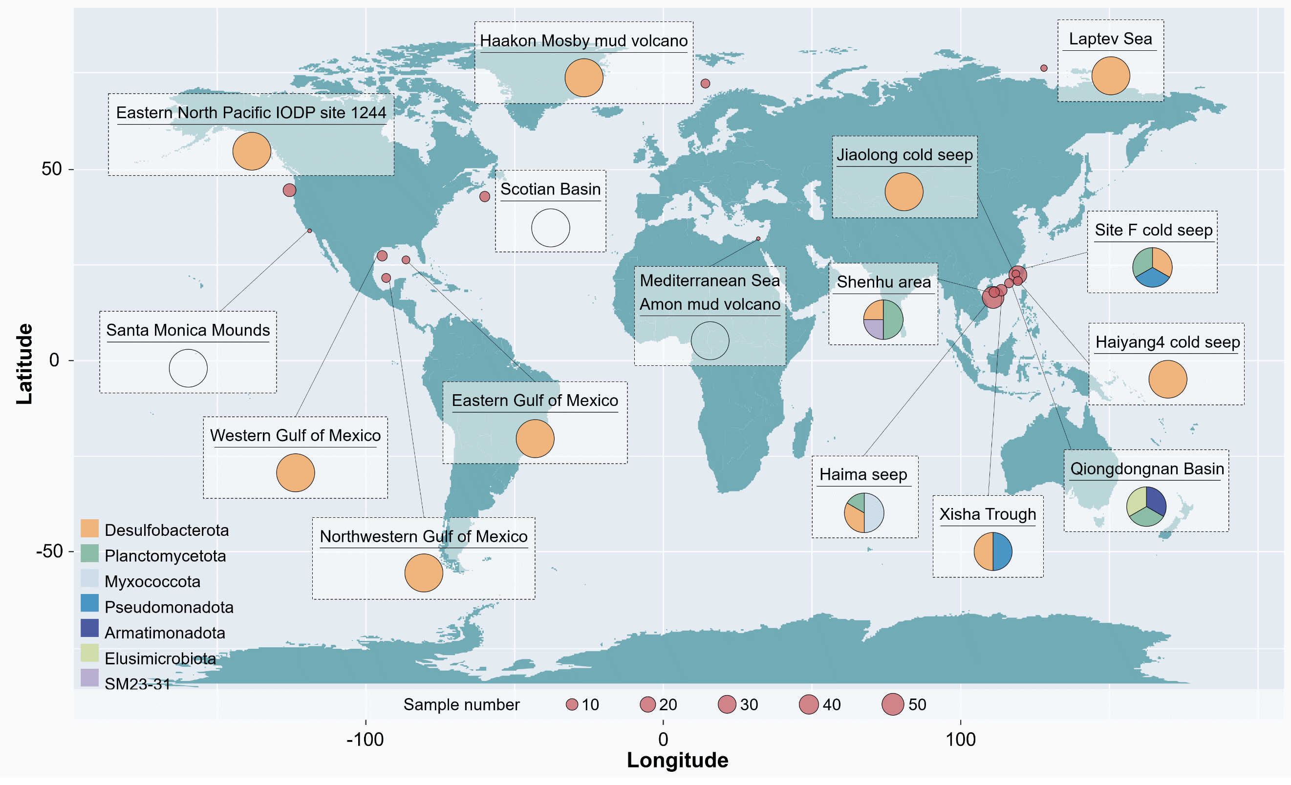 图4 全球冷泉生态系统趋磁细菌(MTB)的分布与系统发育多样性(展示16个全球冷泉站点MTB分布。红点标示冷泉位置,大小对应沉积物样本量;下方饼图显示各站点MTB门水平组成,空白表示未检出MTB)