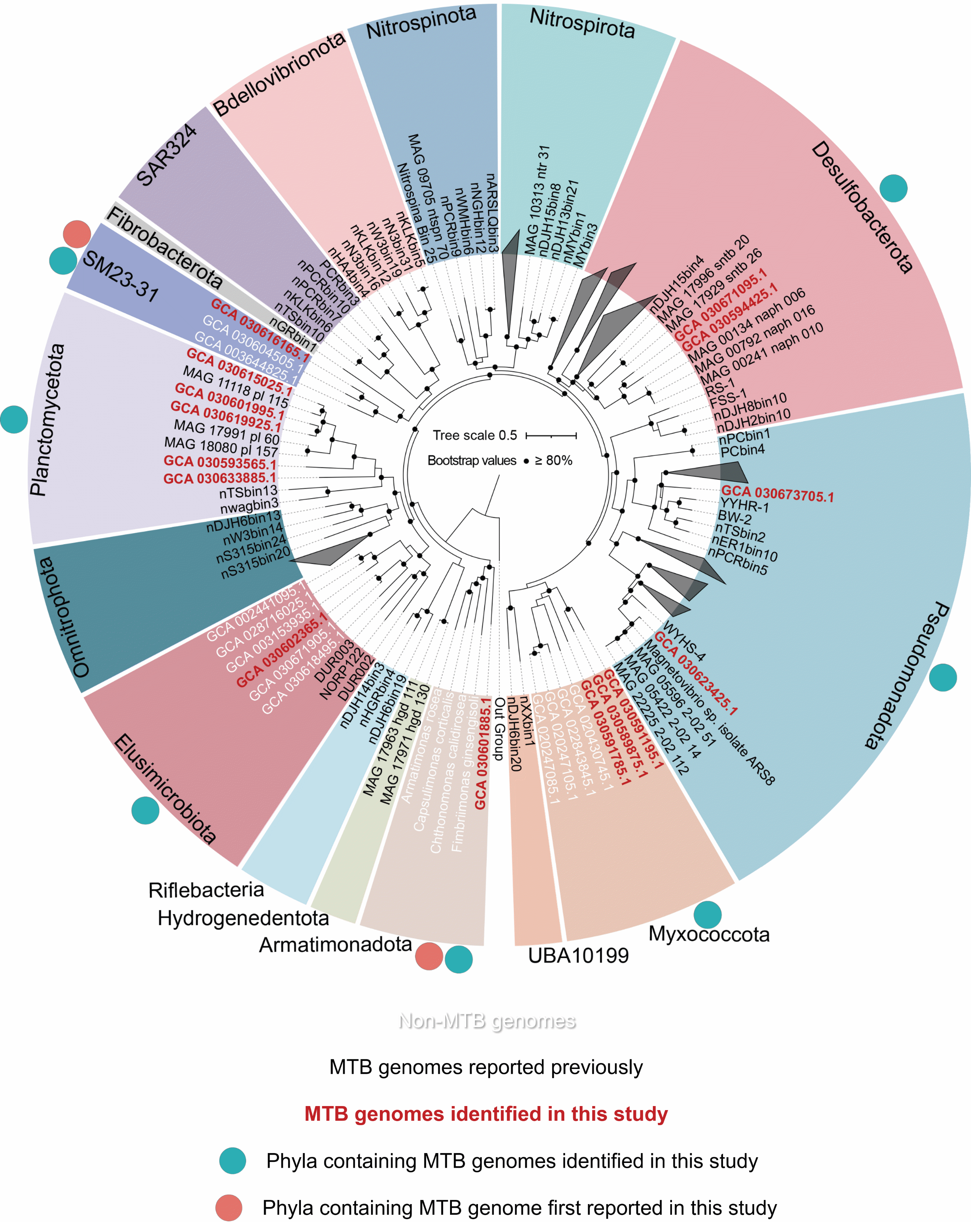 图5 趋磁细菌(MTB)的系统发育树。(基于120个细菌单拷贝标记蛋白构建,节点黑圈表示≥80%的自展支持率)