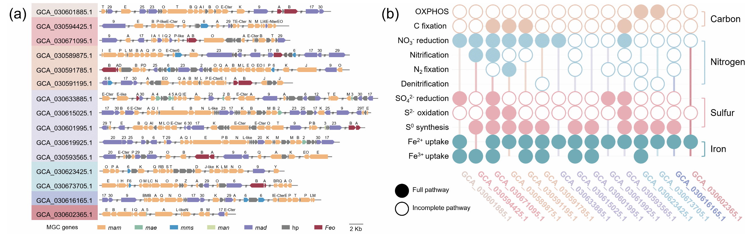图6 15个趋磁细菌基因组的磁小体基因簇及代谢特征。(a) 磁小体基因簇的基因组成与排列;(b) 参与碳、氮、硫、铁代谢的关键基因在15个MTB基因组中的分布热图
