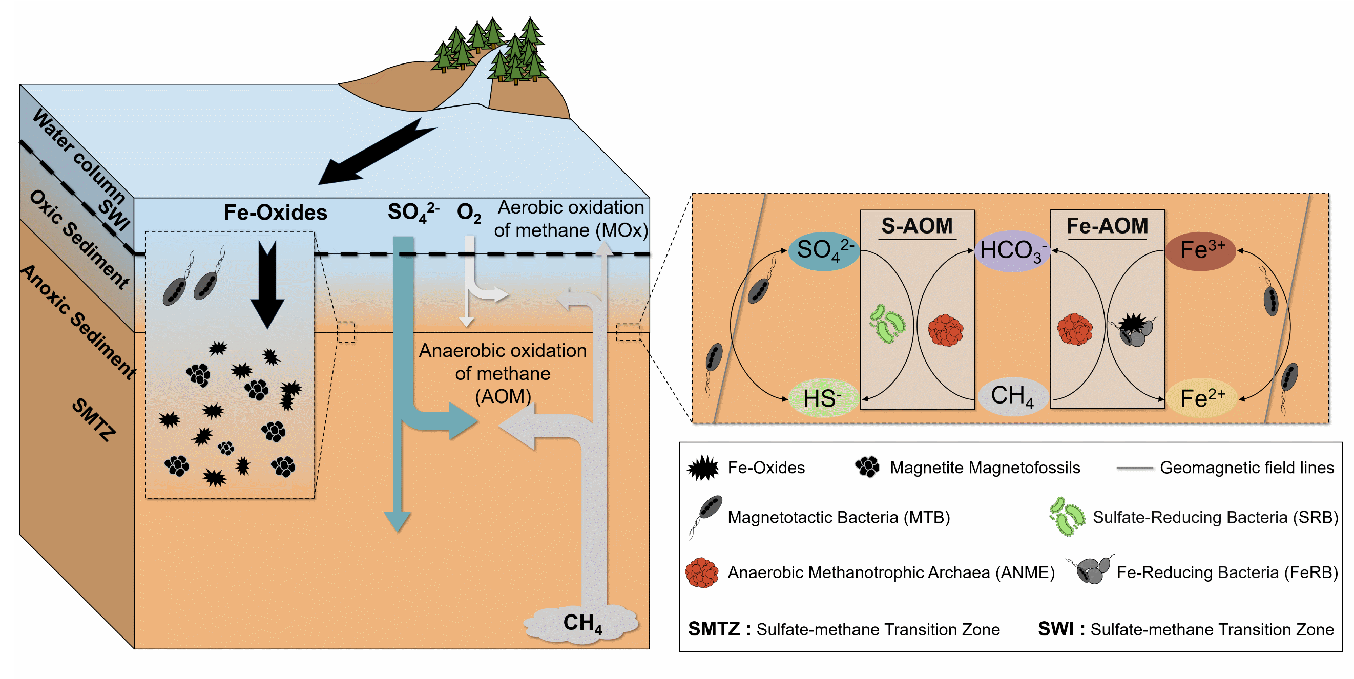 深海冷泉趋磁细菌及其参与元素循环模式图。在富甲烷冷泉沉积物中,趋磁细菌通过细胞内磁铁矿/胶黄铁矿实现沿地球磁场的定向游动,它们通过跨氧化-缺氧界面的铁/硫代谢,可能耦合厌氧甲烷氧化,促进碳酸盐沉淀和有机碳转化,最终在沉积物中留下可识别的生物磁小体化石
