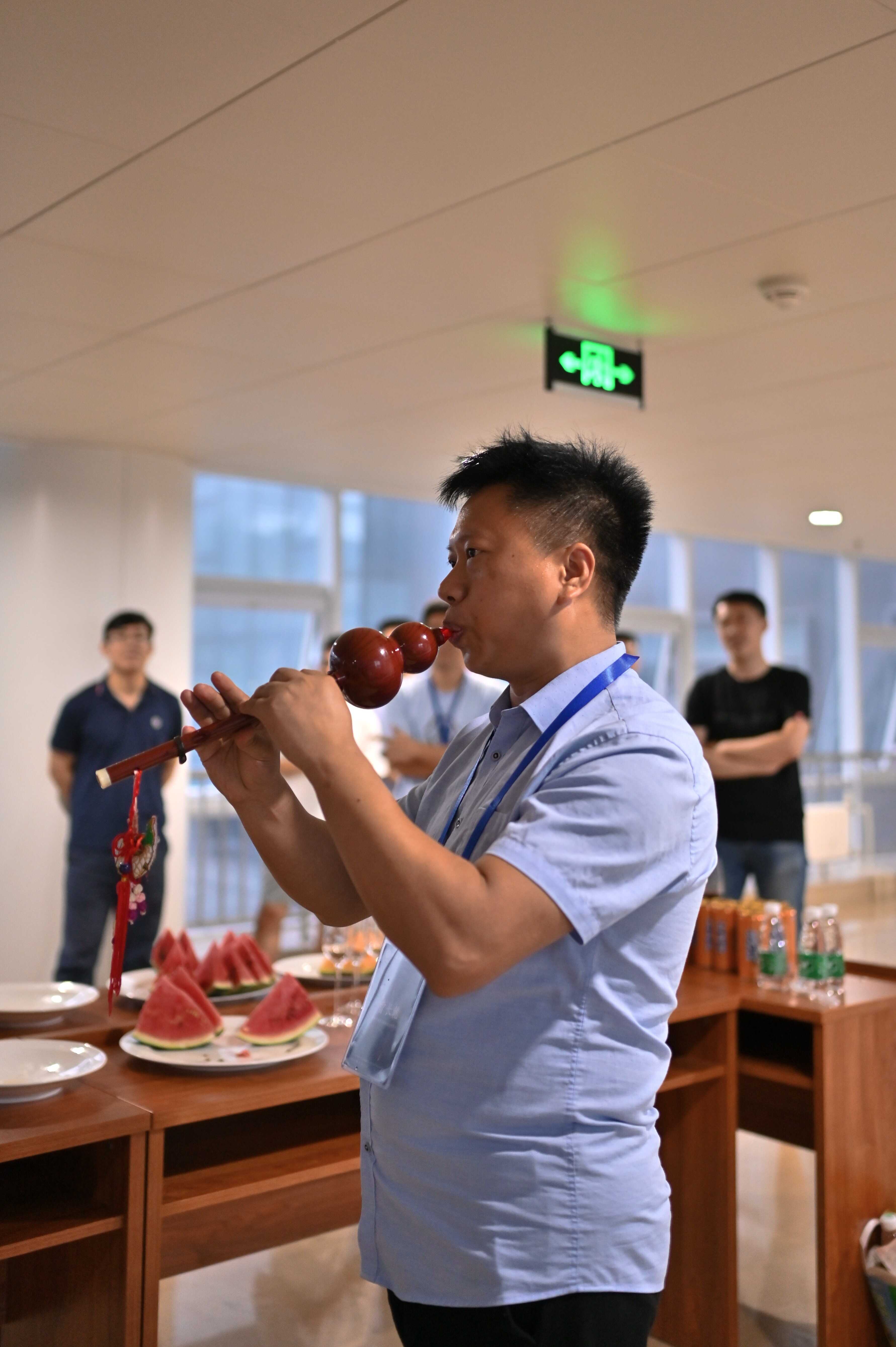 曹长乾在第1届生物地磁培训班课后为学员表演葫芦丝