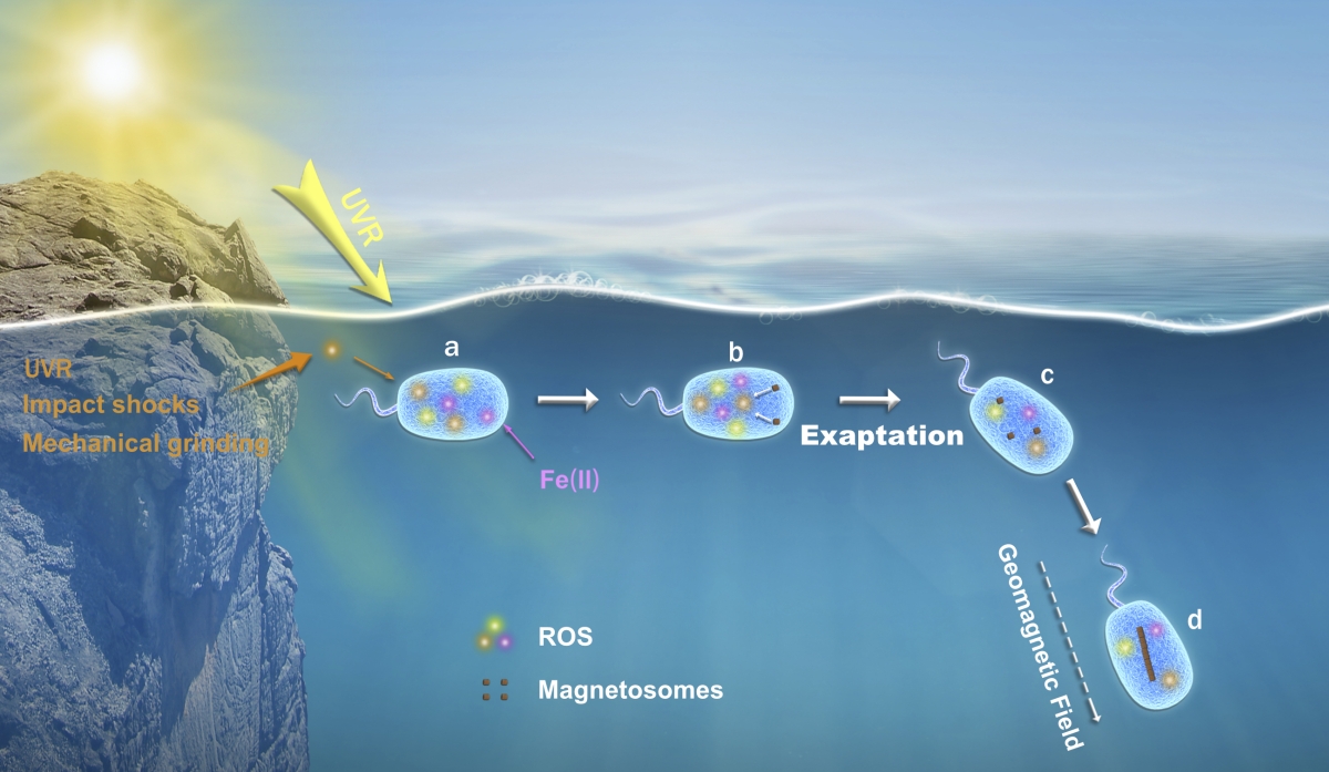 文章在综述趋磁细菌多样性、起源演化、磁小体功能及其矿化机理等最新研究进展的基础上,提出了一种生物感磁起源的新认识:磁小体的原始功能可能不是感应地磁场,而是作为一种纳米酶以降低早期生命体内的活性氧(ROS)浓度,维持细胞内正常的氧化还原水平,帮助这类微生物适应早期地球的高辐射等极端环境;在随后的演化中,磁小体逐渐具有感磁的新功能。这一演化过程被作者称为微生物感磁的扩展适应(Exaptation,图2)。