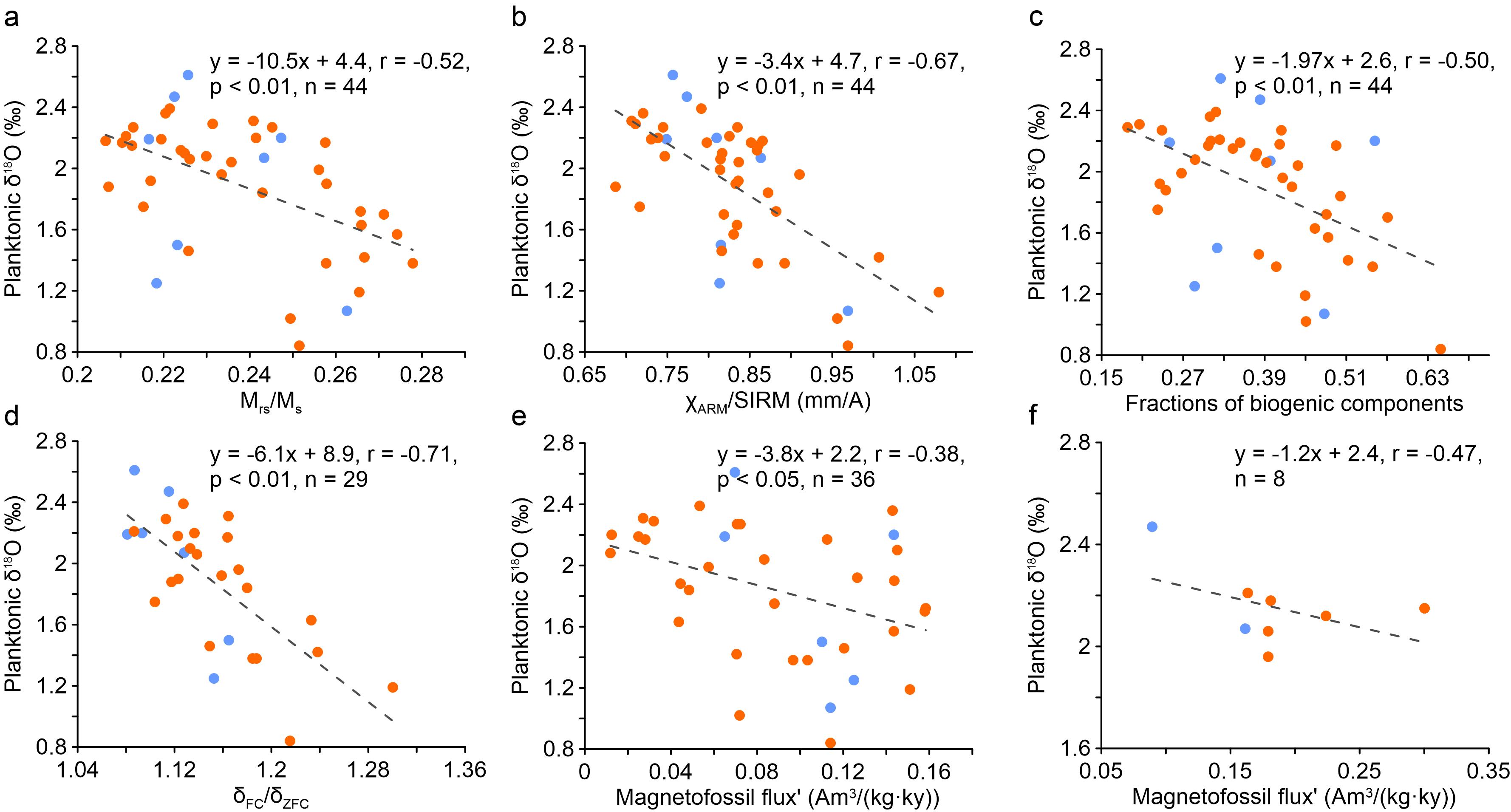 图1 (a-d)不同岩石磁学指标(Mrs/Ms、χARM/SIRM、BS+BH、δFC/δZFC)分别与对应样品浮游有孔虫δ18O值的散点图;(e-f)化石磁小体的近似通量与浮游有孔虫δ18O值的散点图。橘黄点表示根据浮游有孔虫δ18O原始数据线性内插获得的数据,蓝点为浮游有孔虫δ18O原始数据,虚线为线性拟合趋势线