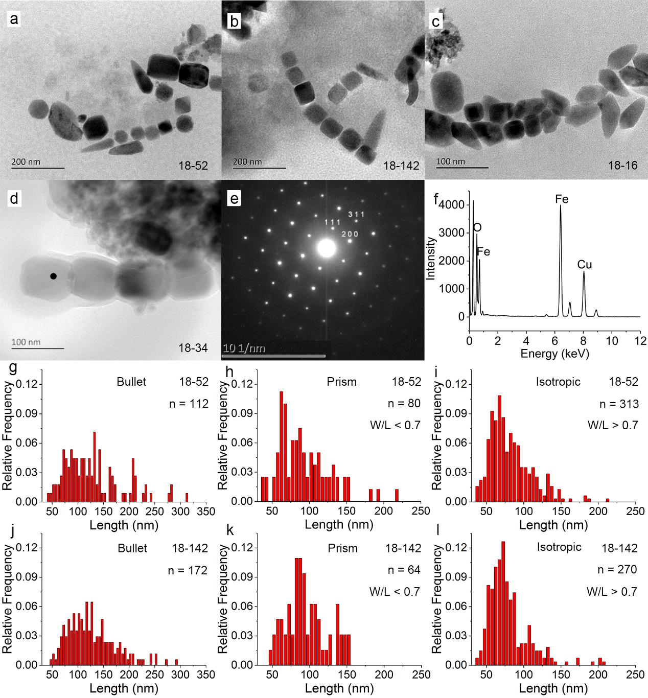 图2 (a-d)化石磁小体的透射电子显微镜照片;(e) d图中化石磁小体标记黑点处的选区电子衍射花样;(f)d图中化石磁小体标记黑点处的X射线能谱分析;(g-l)代表样品18-52(冷期)、18-142(暖期)中子弹头状、棱柱状、匀称状化石磁小体的尺寸分布图