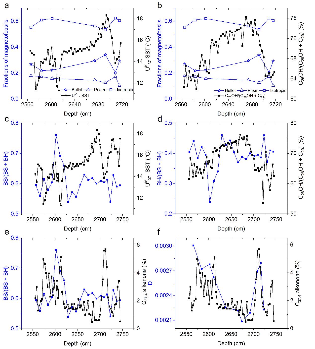 图3 (a-b)193.8-171.7 ka期间不同形态的化石磁小体的比例与古环境代用指标(Uk’37-SST、C26OH/(C26OH+C29))的关系图;(c-e)反映匀称状和拉长状化石磁小体相对比例的岩石磁学指标(BS/(BS+BH)、BH/(BS+BH))与古环境代用指标(Uk’37-SST、C26OH/(C26OH+C29)、C37:4 alkenone)的关系图;(f)反映更多粗颗粒碎屑磁铁矿的指标D与古环境代用指标C37:4 alkenone的关系图
