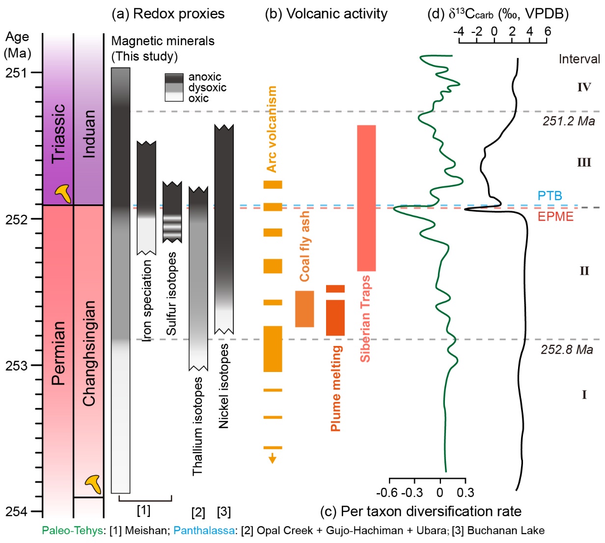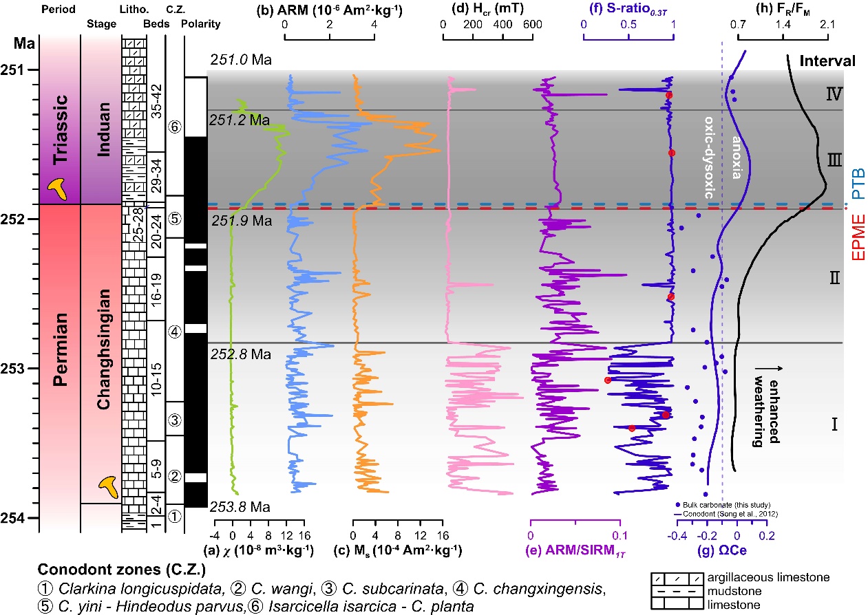 二叠纪末生物大灭绝被认为是地球历史上最严重的生物灭绝事件,在极短时间内(6.1±4.8万年),高达81%的海洋物种遭受灭顶之灾。揭示二叠纪末生物灭绝机制对于理解环境变化和生物演化之间的关系至关重要。前人通过地球化学指标(如生物标志化合物、铁组分)和同位素(如铀同位素等)分析,研究二叠纪末古海洋短期氧化还原历史。针对二叠纪末古海洋氧化还原状态及演化的科学问题,中国科学院地质与地球物理研究所地球与行星物理院重点实验室地球与行星磁场及宜居性研究团队章敏博士后和潘永信院士,联合南京大学沈树忠院士,岩石圈演化国家重点实验室邓成龙研究员、秦华峰副研究员和侯祎斐博士后,以及中国海洋大学何况副教授,详细开展了浙江煤山“金钉子”剖面的环境磁学研究,获得了二叠纪末古海洋氧化还原状态演化的新结果。