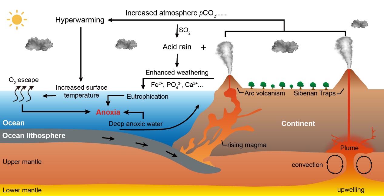 为了认识二叠纪末古海洋氧化还原状态演化以及大陆风化强度变化的驱动机制,研究团队综合对比二叠纪末环境、地质和生物事件,推断地幔柱和火山活动可能触发了古海洋的去氧。大规模的火山喷发及其产生的环境效应加剧了古海洋缺氧以及大陆风化(图3)。随着火山活动逐渐减弱,古海洋氧化还原状态以及陆地化学风化强度逐渐得以恢复。该研究成果为二叠纪末期的全球性古海洋缺氧可能是导致海洋生物大灭绝直接的主要环境因素之一提供了关键证据。