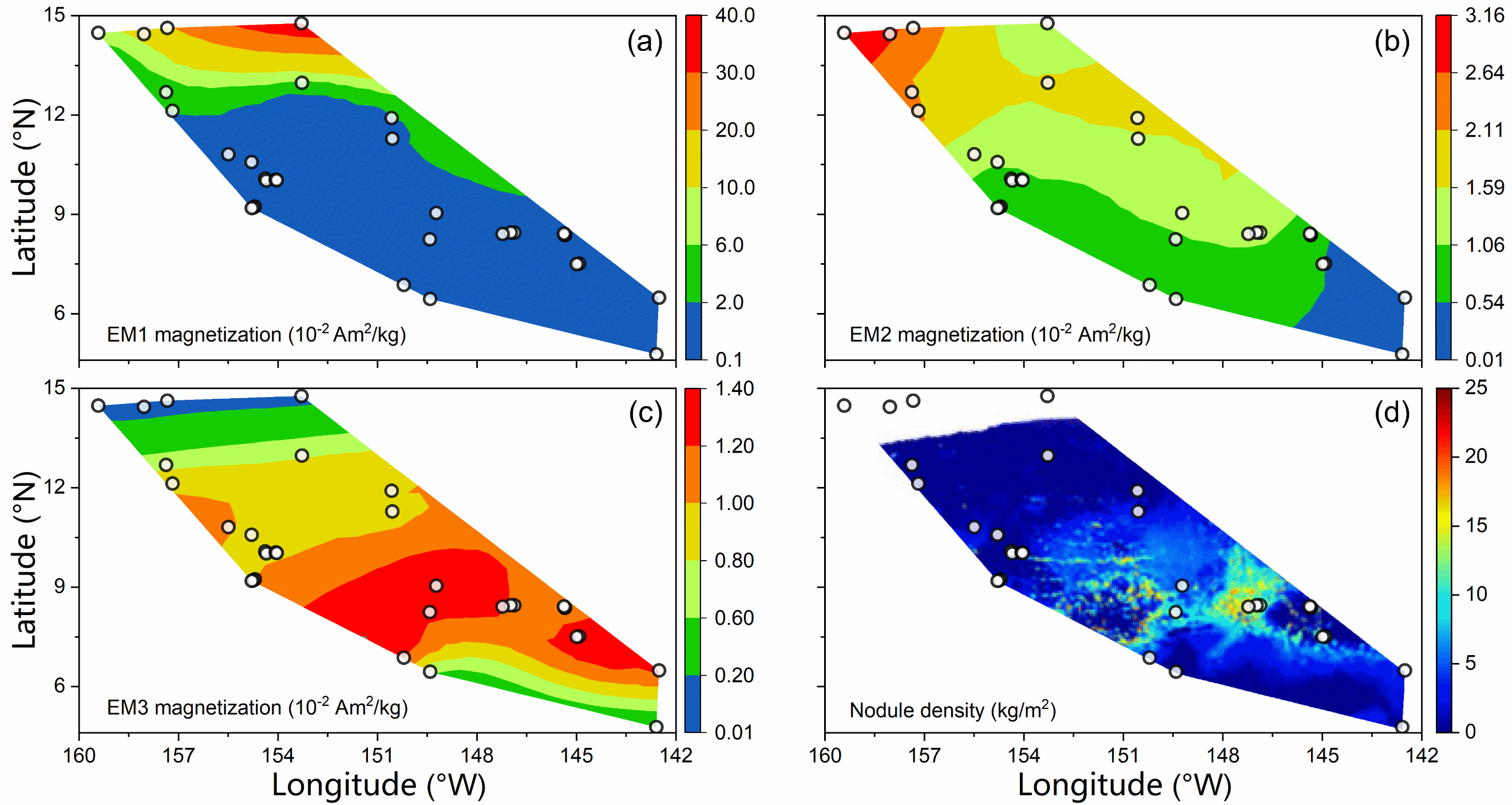 最近,中国科学院地质与地球物理研究所李金华研究员团队与国内外合作者,综合运用岩石磁学、电子显微学和地球化学技术,对32个不同点位的表层沉积物开展了研究(图1),量化识别了磁性矿物的类型及其空间分布特征,发现多金属结核的分布与趋磁细菌磁小体丰度之间存在相关性,为理解多金属结核生长过程中的微生物-矿物相互作用提供了新证据,也为深入认识深海趋磁细菌生态分布规律及其参与和记录的生物地质过程提供新线索。