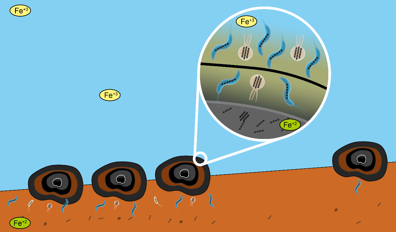 在基于系统电子显微学和地球化学分析精确识别样品中磁性矿物来源的基础上,他们对32个表层沉积物样品进行了FORC-PCA的三端元分解分析,结果表明:(1)东太平洋多金属结核区的风尘来源的磁性矿物浓度呈现出从北向南、从东向西逐渐减少的趋势(图3a),这表明中纬度西风带和东北信风共同推动了碎屑矿物的迁移;(2)火山成因的磁铁矿含量从西向东、从北向南逐渐减少势(图3b),这与南极底层水对莱恩群岛和夏威夷群岛的侵蚀作用密切相关;(3)生物成因磁小体的丰度与多金属结核的分布吻合(图3c、图3d),表明多金属结核水-岩界面富含有机质的轻度还原微环境为趋磁细菌的生存提供了理想条件(图4),进一步证明东太平洋多金属结核海底趋磁细菌的生长主要受到局部氧化还原条件的驱动。