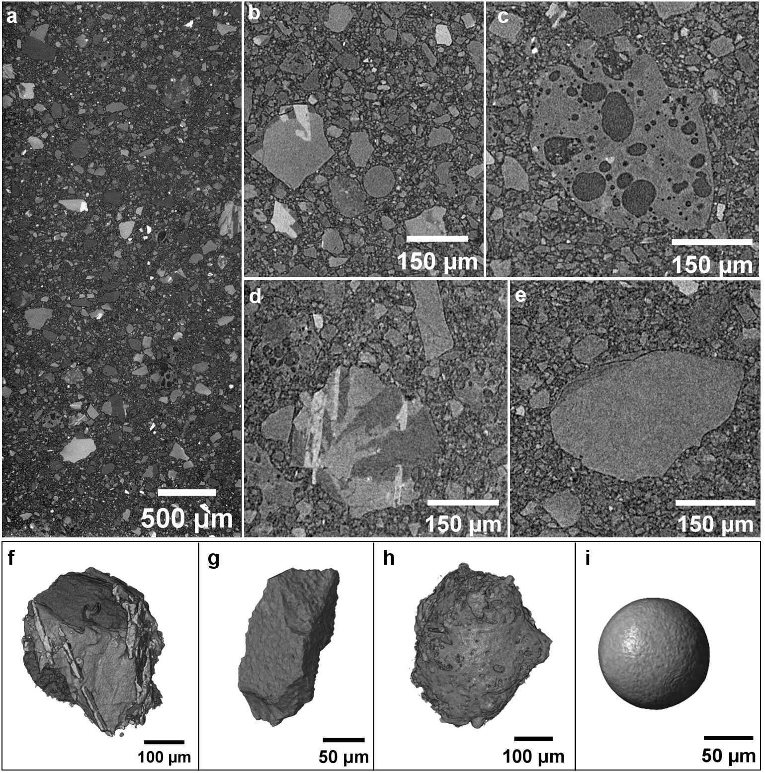 图2 嫦娥六号(CE6)月壤的无损三维X射线显微(3D-XRM)成像与重建结果。a. 在约1微米体素分辨率下获取的二维切片,展示月壤的整体成分组成。b-e. 在约500纳米体素分辨率下,从代表性微区获取的放大二维切片,突出显示详细的内部结构纹理。f-i. 代表性颗粒的三维重建模型:f. 玄武岩颗粒;g. 角砾岩颗粒;h. 胶结物颗粒;i. 玻璃质颗粒