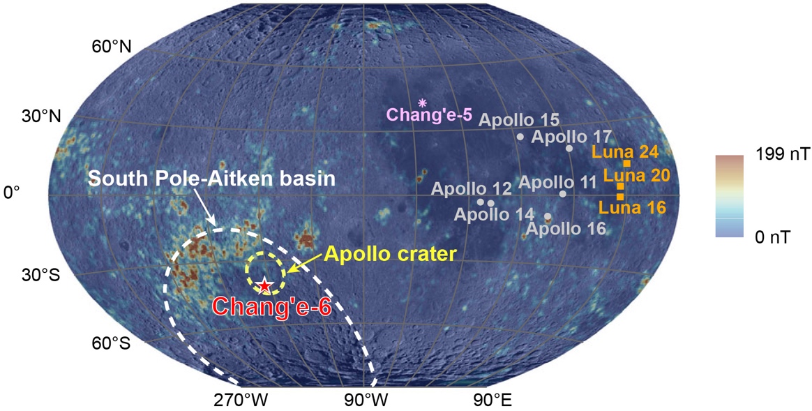图1 月球表面磁异常及月球探测任务着陆点分布