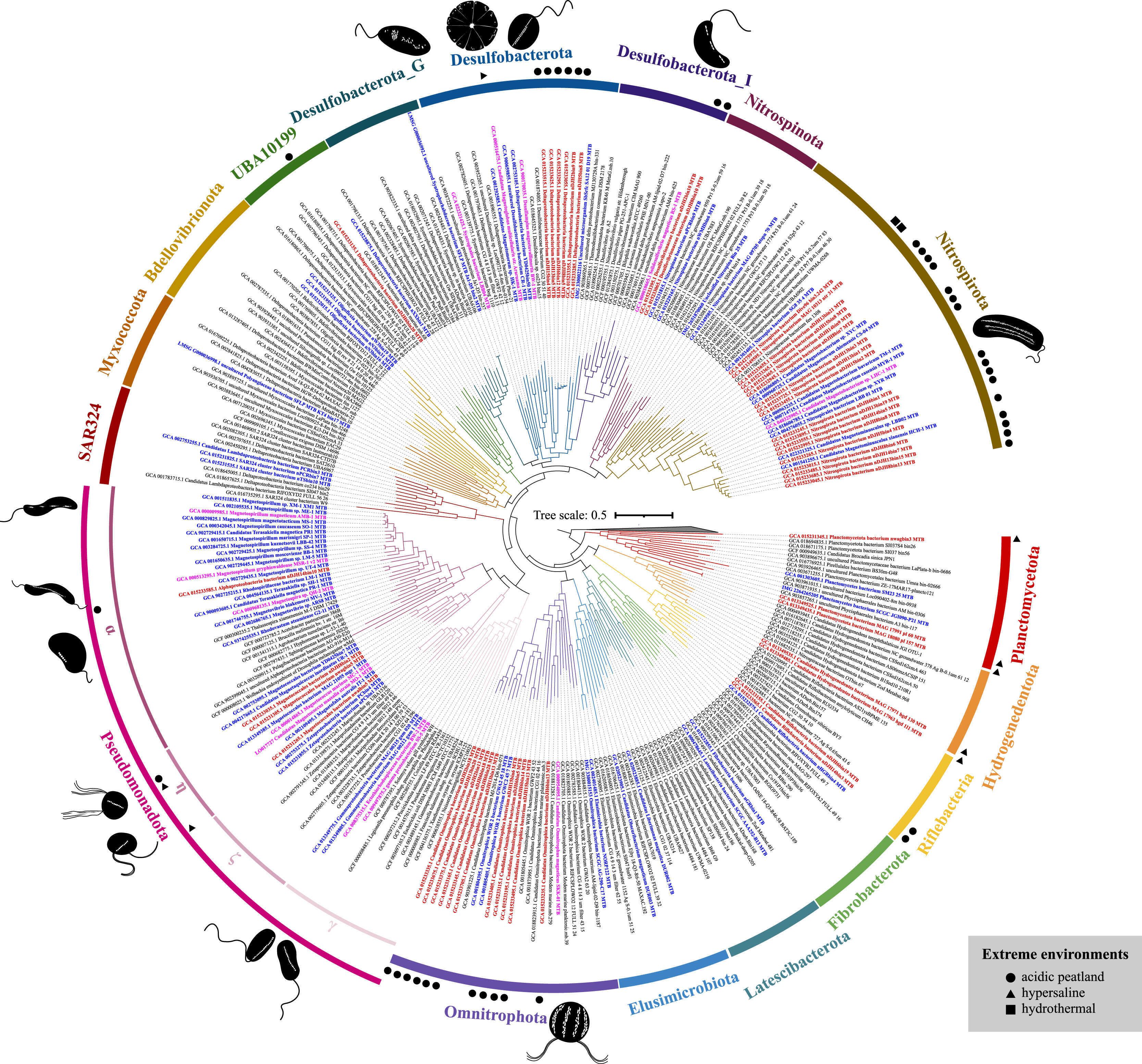 图1 趋磁细菌的系统发育树。最外圈展示了17个细菌门和代表性趋磁细菌的形态。内圈展示细菌名称,红色代表从极端环境中获得的趋磁细菌、洋红色代表已进行形态学观察的趋磁细菌、蓝色代表已获得基因组草图的趋磁细菌、黑色代表非趋磁细菌。特定极端环境中获得的趋磁细菌用不同形状指示,圆形表示酸性泥炭地,三角形表示高盐环境,正方形表示热液环境