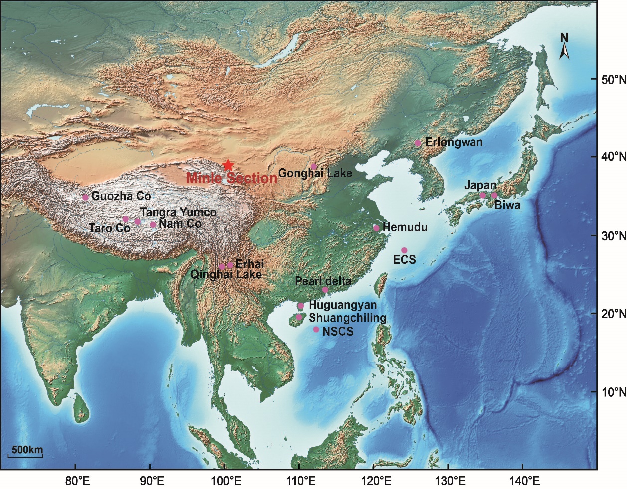 图1 东亚地区相关PSV记录与民乐剖面位置分布