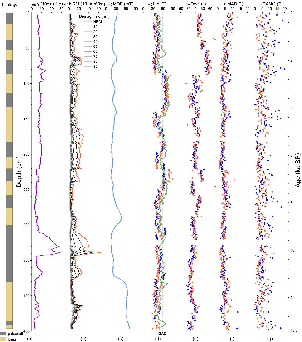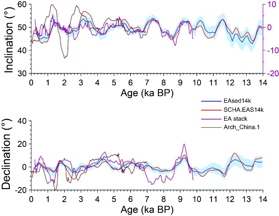 中国科学院地质与地球物理研究所地球与行星物理重点实验室博士生樊耘畅在导师潘永信研究员和蔡书慧副研究员的指导下,联合岩石圈演化国家重点实验室邓成龙研究员,西班牙马德里康普顿斯大学Francisco Javier Pavón-Carrasco副教授和中国地震局地质研究所熊建国研究员,对甘肃西北部全新世黄土-古土壤高沉积速率剖面(民乐剖面)开展地磁场长期变研究,获得了该地区全新世地磁场方向(偏角和倾角)绝对变化记录,并结合东亚已有数据,建立了14 ka以来东亚地磁场长期变化参考曲线和东亚区域地磁场方向变化模型。