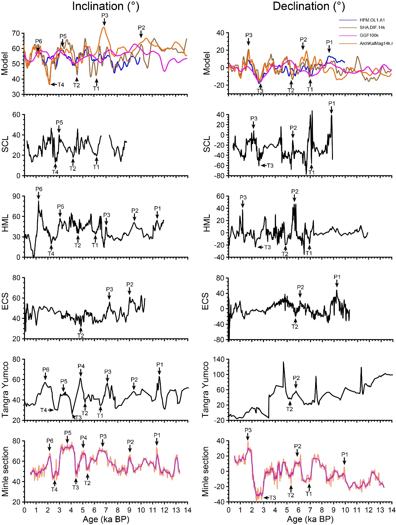 图4 EASed14k参考曲线与Zheng等(2014)发表的东亚PSV集成曲线、中国考古磁学PSV曲线、SCHA.EAS14k区域模型预测结果对比