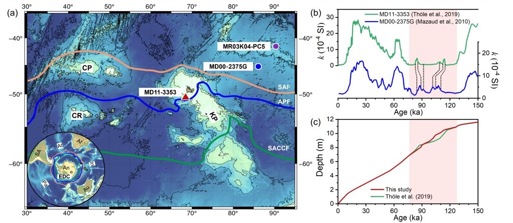 南大洋环绕南极洲,是太平洋、大西洋及印度洋南部海域的延伸,拥有独特的洋流、生态和气候特点,在全球大洋环流和气候变化中扮演着至关重要的角色。受绕极西风带的风场驱动,南极绕极流(Antarctic Circumpolar Current, ACC)自西向东横贯太平洋、大西洋和印度洋,推动全球经向翻转流循环和深渊海与大气物质能量交换,从而对海洋温盐循环和全球碳循环发挥重要调控作用。然而,受限于现有替代指标的多解性及南半球复杂的岛屿分布,在冰期间冰期尺度上,南大洋的古气候和古洋流重建仍存在争议。比如:在南印度洋钻孔沉积物过去400千年的环境磁学研究中认为,冰期阶段碎屑钛磁铁矿含量的增加及粒度的变粗指示着南极绕极流强度和侵蚀能力的增加,而间冰期阶段磁铁矿含量的减少和粒度的变细表明绕极流强度和剥蚀能力的减弱。然而,最近在德雷克海峡的沉积物粒度研究中指出,间冰期阶段沉积物粗的颗粒粒度和低的累计速率指示着南极绕极流强度的增加及分选性的增强。相反,冰期阶段细的沉积物颗粒粒度和高的累计速率指示着南极绕极流强度和分选性的减弱。