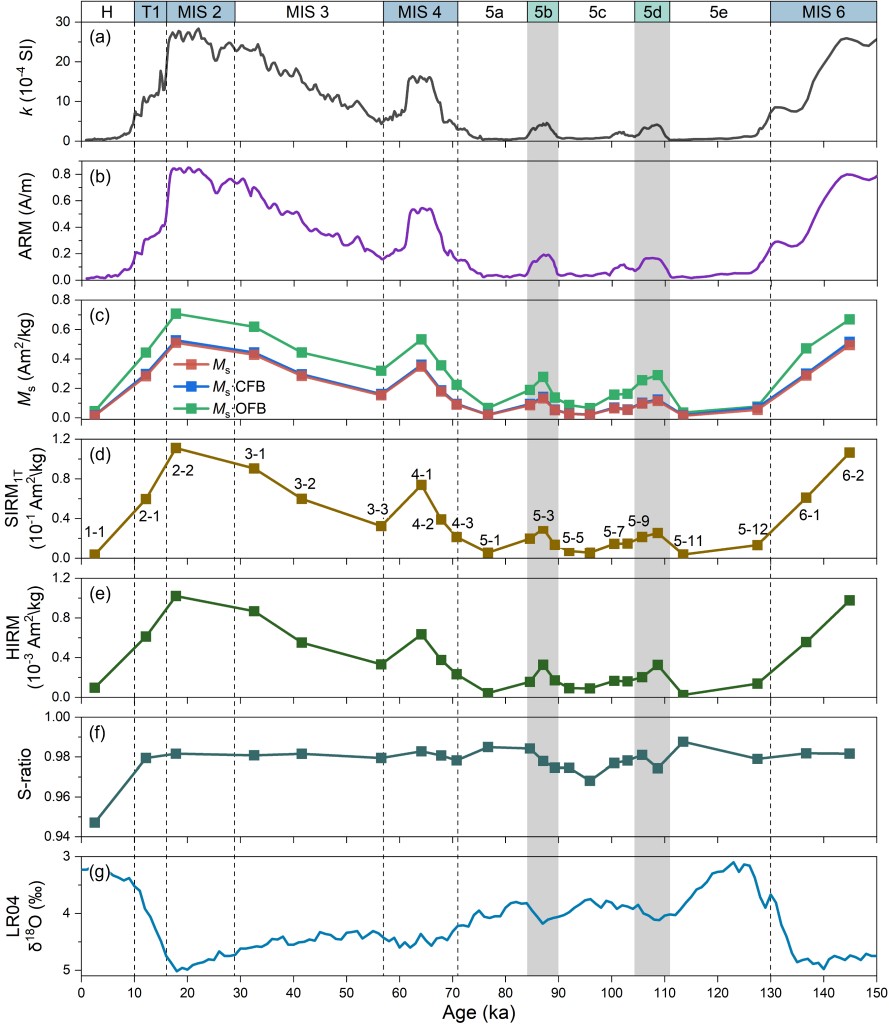 图2 钻孔MD11-3353过去150千年浓度磁学参数变化。(a) 磁化率,k;(b)非磁滞剩磁,ARM;(c)饱和磁化强度,Ms;(d) 饱和等温剩磁,SIRM1T;(e) 硬饱和剩磁强度,HIRM;(f) S-ratio;(g) LR04深海氧同位素曲线