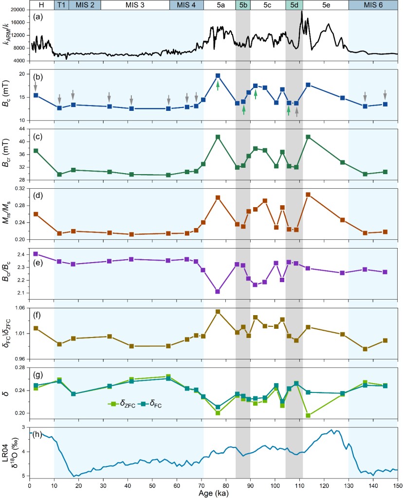 图3 钻孔MD11-3353过去150千年非浓度磁学参数变化。(a) 磁化率,k;(b) 矫顽力,Bc;(c) 剩磁矫顽力,Bcr;(d) Mrs/Ms;(e) Bcr/Bc;(f) FC/ ZFC,(g) FC和 ZFC;(h) LR04深海氧同位素曲线
