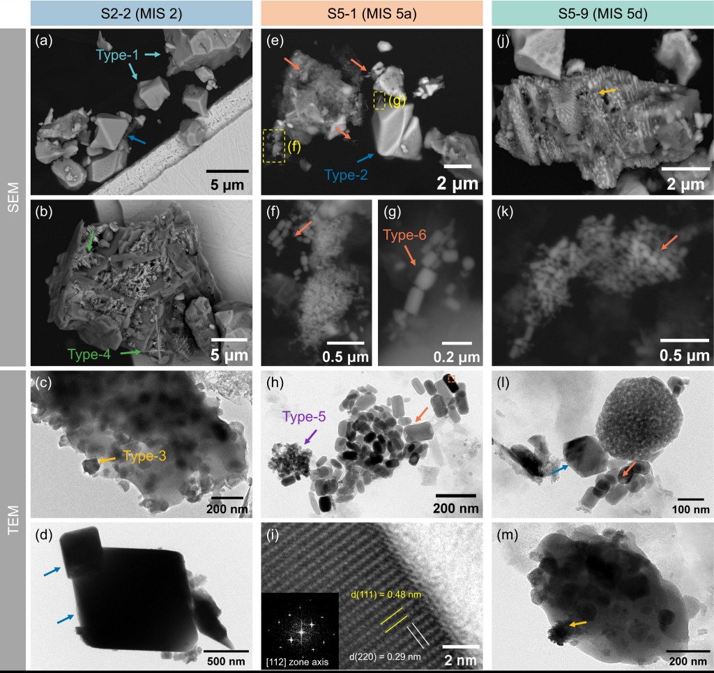 图4 来自于冰期(MIS 2,样品S2-2)和间冰期(MIS 5a,样品S5-1; MIS 5d,样品S5-9)3个代表性样品的电子显微学结果。(a、b、e-g、j、k) 扫描电子显微镜图像;(c,d,h,l,m) 透射电子显微镜图像;(i) 图h中橘色方框标识的磁小体颗粒高分辨图像,左下角插图为该颗粒的选取电子衍射花样