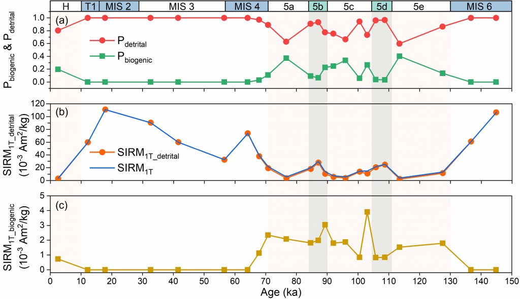 (3)不同类型磁性矿物的量化识别:在上述准确磁性矿物鉴定结果指导下,指出由于碎屑成因的包体含钛磁铁矿和生物成因磁小体化石矫顽力谱的重叠,被广泛应用的饱和等温剩磁曲线分解定量方法并不适用于该地区沉积物中碎屑和生物磁性矿物的定量分析。因此,该研究提出一种新的磁小体化石含量计算方法,即利用间冰期沉积物(由碎屑和生物成因磁铁矿二者混合贡献)与冰期沉积物(由碎屑成因磁铁矿贡献)的剩磁比差值,作为该钻孔沉积物间冰期中磁小体化石相对丰度的变化,再分别乘上饱和剩磁值,就大致获得碎屑成因磁铁矿和生物成因磁铁矿的绝对含量变化。定量结果表明,该钻孔沉积物饱和剩磁主要由碎屑成因磁铁矿主导,即浓度磁学参数(如 , Ms, SIRM1T和HIRM)指示着碎屑成因磁性矿物含量的变化;在间冰期中由于生物成因磁铁矿的加入,造成粒度磁学参数显著变化(如 ARM/ )(图5)。