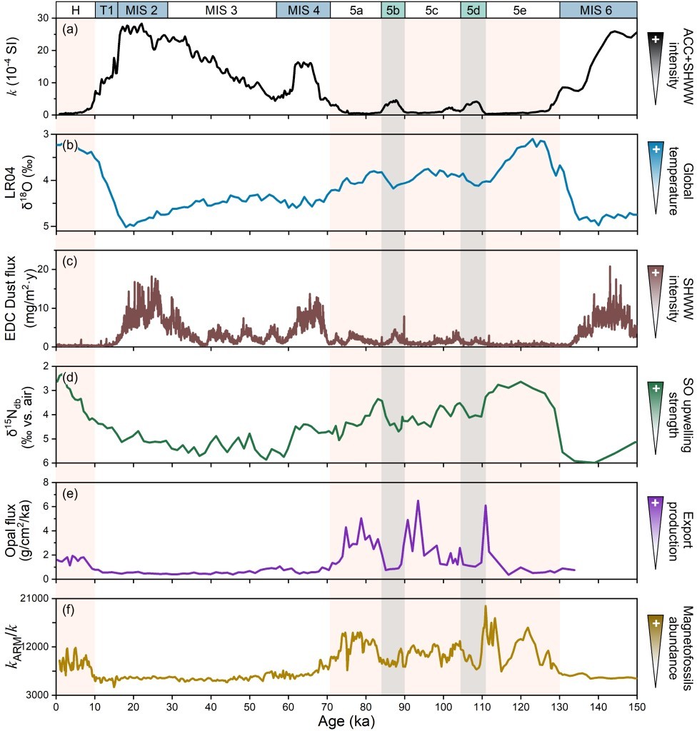 总之,该研究发现南印度洋钻孔MD11-3353沉积物中碎屑和生物成因磁铁矿含量的变化分别记录了过去150千年南大洋南极绕极流和上升流的强度变化,即冰期阶段南极绕极流强度增加,上升流减弱,间冰期反之(图6)。该项研究不同与前人在南大洋其它钻孔研究中提出的大陆风尘输入的铁施肥效应促进了趋磁细菌生物矿化过程,首次揭示了该地区趋磁细菌丰度变化受控于上升流携带的营养物质,更重要的是得到的高分辨率南极绕极流和上升流强度变化对理解全球海洋环流系统及大气二氧化碳变化具有重要意义。