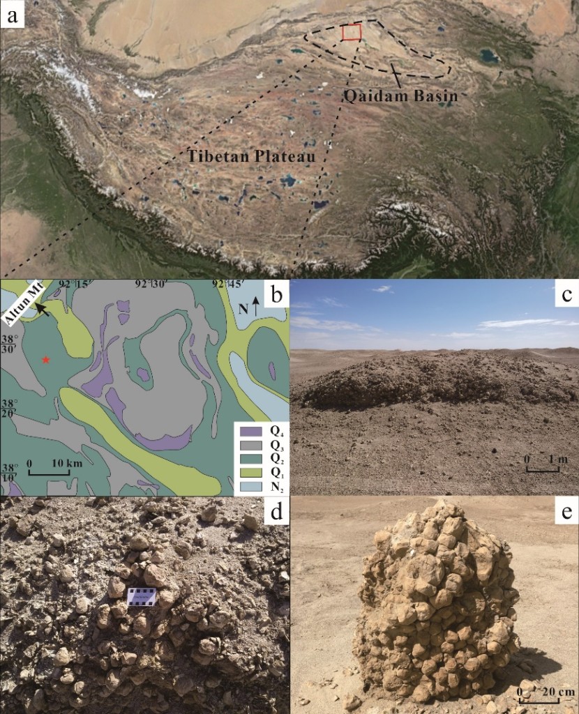 图1 柴达木盆地碳酸盐结核出露区域的地质背景。(a)柴达木盆地的地理位置;(b)结核样品的采样地点及地质背景;(c-e)结核样品的野外照片