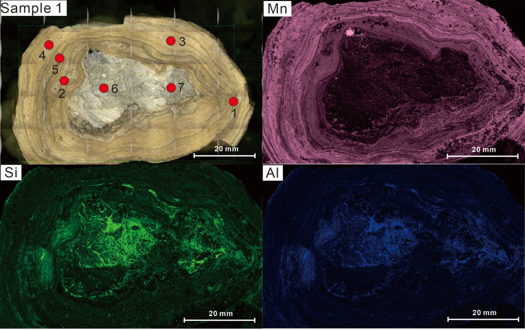 近日,中国科学院地质与地球物理研究所地球与行星物理院重点实验室地球与行星磁场及宜居性学科组的陈妍博士后与合作导师林巍研究员等,联合中科院深海科学与工程研究所屈原皋研究员团队,利用X射线荧光光谱和傅里叶转换红外光谱(FTIR)对柴达木盆地的典型结核样品进行了系统分析。X射线荧光光谱研究发现,结核的核部几乎不含元素Mn,而外部圈层具有较高的Mn含量(图2)。结核外部圈层的Mn分布具有明显的环带结构,其中疏松环带的Mn含量较致密环带的要高。样品中Si和Al等元素的分布没有表现出明显的环带结构。