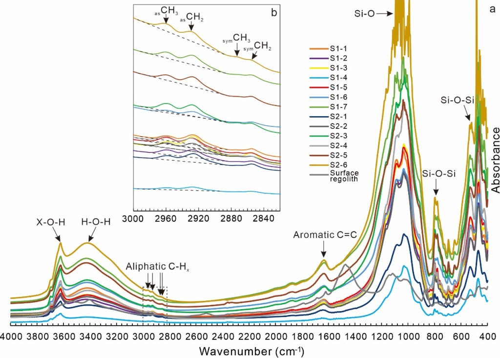 图3 柴达木盆地碳酸盐结核样品及其表面风化壳的傅里叶转换红外吸收光谱。(a)400-4000 cm-1的光谱范围;(b)2820-3000 cm-1的光谱范围。其中~2850、~2925、~2870和~2960 cm-1吸收峰代表了脂肪族结构C-H键不同的振动模式