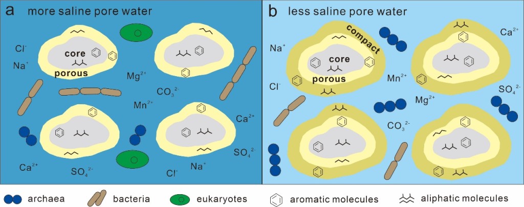 图4 柴达木盆地结核样品中碳质生物信号以及成岩流体中微生物群落变化的示意图。(a)结核疏松高Mn环带R3/2值较低,指示了盐度较高的孔隙水含有古菌和细菌并可能有真核生物;(b)结核致密低Mn环带R3/2值较高,指示了盐度较低的孔隙水中可能含有细菌和更多的古菌
