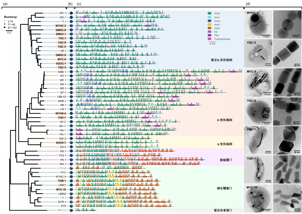 图2 47个趋磁细菌数据集的系统发育(a)、基因组完成度(b)、磁小体基因(c)和代表性细胞和磁小体透射电镜图片(d)