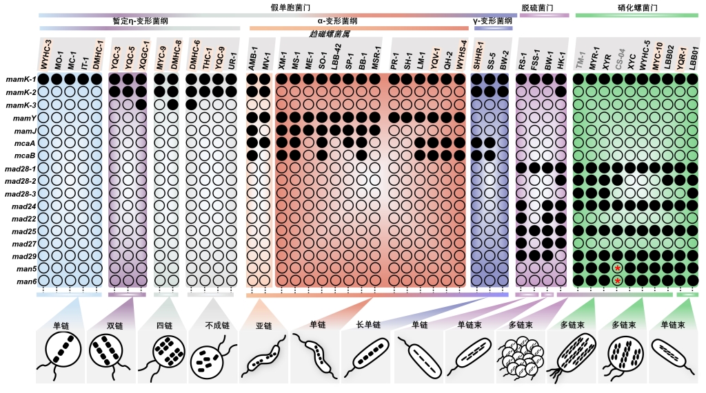 生物矿化在生物界广泛存在,生物矿物的形成过程及其分子机制一直是地球科学与生命科学的交叉前沿,但也是研究的难点。在最近发表于《国家科学评论》的文章中,中国科学院地质与地球物理研究所李金华研究员和潘永信院士带领的国际研究团队,通过比较基因组学和比较表型组学的关联研究,揭示趋磁细菌系统中调控磁小体生物矿化和链组装的关键基因网络,并提出磁小体生物矿化的通用模式图,为未来更深入地基因功能鉴定和生物仿生矿化提供指导框架,也为地质记录中磁小体化石的识别提供理论依据。