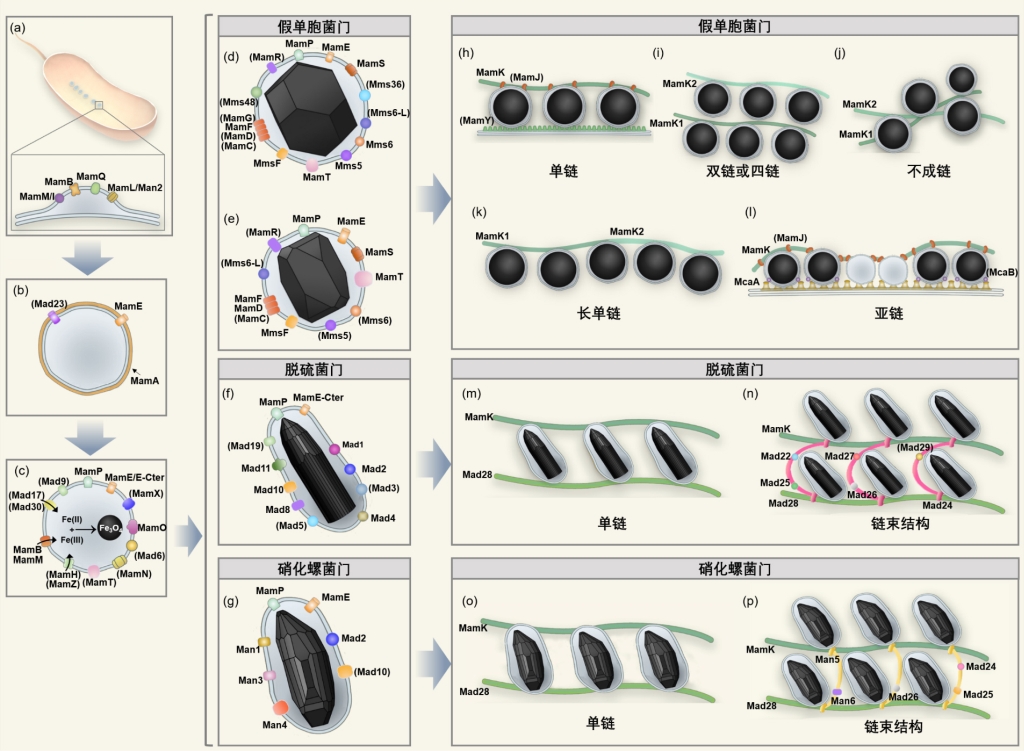 通过磁小体“链结构-基因” 的关联分析和蛋白质功能的生物信息学预测,识别调控磁小体链组装的关键基因(图4)。结果表明:(1)前人鉴定的磁小体链骨架基因mamK在所有趋磁细菌中严格保守,这进一步确认了其在磁小体链组装过程中的关键作用;(2)前人发现的与链结构有关的基因,如mamJ、mamY、mad28以及macAB,只在部分趋磁细菌类群中分布,说明它们在不同趋磁细菌系统发育群中导致了磁小体链结构的多样性;(3)mamK基因的多拷贝导致假单胞菌门暂定η-变形菌纲趋磁细菌的磁小体链由一条变成多条,而多拷贝mamK基因之间的相似性决定了其链结构为双链、四链还是不成链;(4)mcaA基因只有位于磁小体基因簇中时才能发挥在成熟磁小体之间加入新的磁小体的功能;(5)γ-变形菌纲趋磁细菌两个相邻的mamK基因可能受一个操纵子调控,合成一条长的磁小体链;(6)mad24和man5基因的编码蛋白都具有一个SMC结构域和两端的金属离子亲和区,这暗示它们可能分别与脱硫菌门和硝化螺菌门中磁小体链束结构有关。