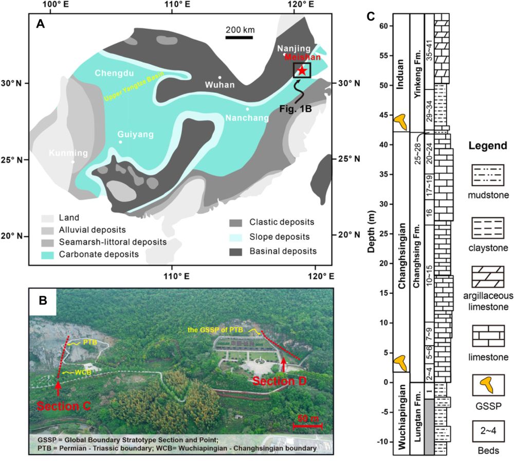 晚二叠世生物大灭绝事件(EPME)是显生宙最严重的一次生物灭绝事件,导致了超过80%海洋生物种的消失,同时重创了陆地生态系统。浙江长兴县煤山剖面主要为浅海相-斜坡相生物碎屑灰岩,完整记录了晚二叠世海相生物灭绝过程;该剖面包括了二叠纪-三叠纪界线(PTB)和长兴阶-吴家坪阶界线两个“金钉子”( GSSP)(图1),因此在国际晚二叠世生物大灭绝研究中至关重要。在过去三十多年,国内外学者在煤山剖面做了大量工作,包括高精度CA-ID-TIMS U-Pb定年、磁性地层、化学地层、生物地层以及旋回地层,为全球海相地层对比提供了依据,深化了对晚二叠世生物大灭绝的认识。