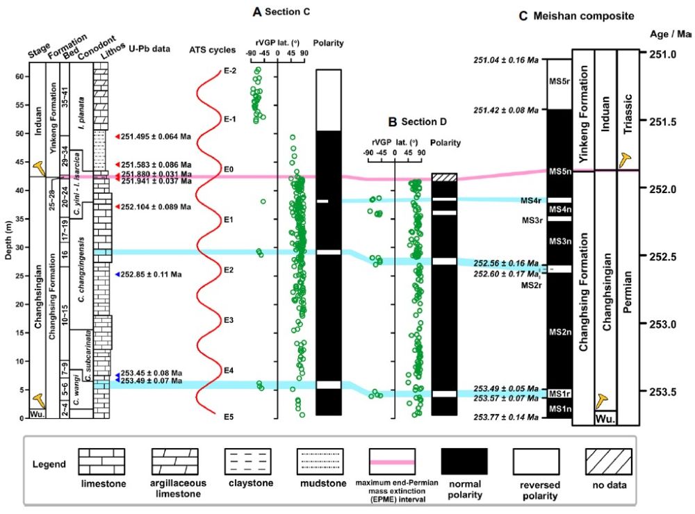 最近,地球与行星物理院重点实验室地磁场与生物圈演化学科组博士研究生章敏与导师潘永信研究员、何况博士,岩石圈演化国家重点实验室古地磁学科组秦华峰副研究员、侯祎斐研究生、邓成龙研究员和朱日祥研究员,与南京大学沈树忠教授、南京地质古生物研究所郑全峰研究员、长兴“金钉子”自然保护区何燕等合作,对煤山“金钉子”剖面开展高分辨率的磁性地层学研究,建立了煤山剖面可靠的磁极性序列,为晚二叠世长兴阶-印度阶海相地层和陆相地层对比提供新的对比依据,并为该时期地磁极性年表提供了重要参考。