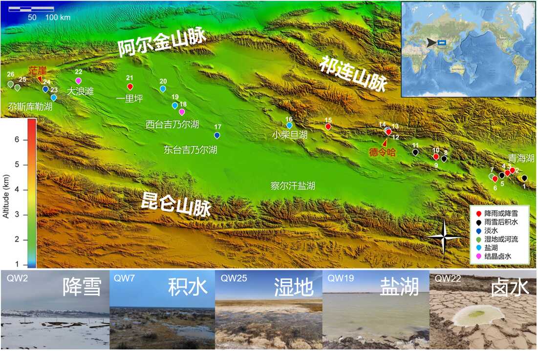 中国科学院地质与地球物理研究所地球与行星磁场及宜居性学科组的申建勋博士后与合作导师林巍研究员,联合中国科学院页岩气与地质工程重点实验室的黄天明研究员等,在柴达木盆地纬向中轴线的典型类火星环境中,沿干旱梯度分别采集了大气降水、雨/雪后积水、湿地、盐湖、卤水等不同类型共计26个水样(图1),对这些样品开展了系统的水化学和同位素研究。