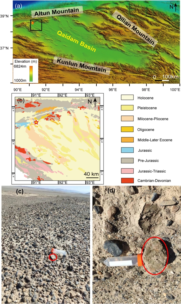 图1 柴达木盆地采样点(a)地形图、(b)地质图以及(c和d)石英岩碎屑样品