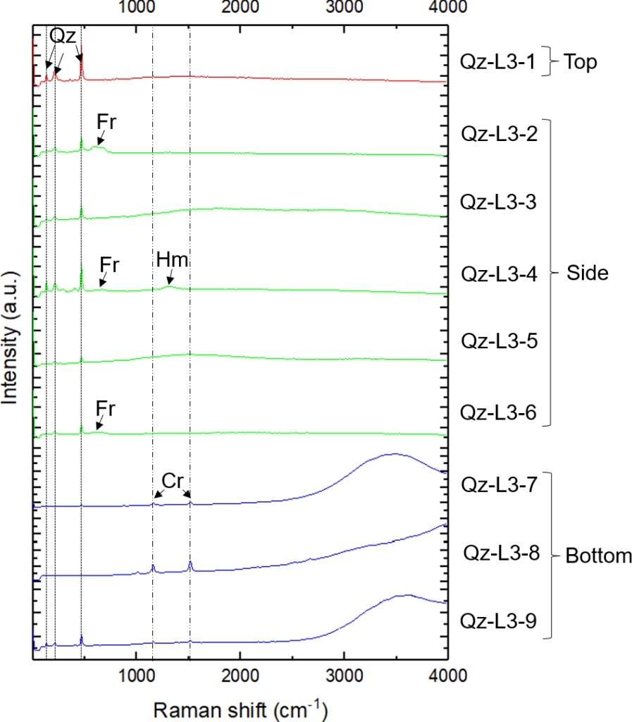 图2 柴达木盆地西北干旱区类火星环境石英岩碎屑样品部分测量位点的拉曼光谱图。Qz:石英;Fr:锌铁矿;Hm:赤铁矿;Cr:β-胡萝卜素