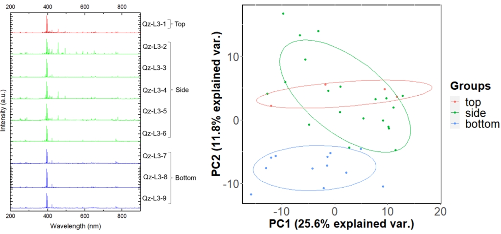 图3 类火星环境石英岩碎屑样品部分测量位点的LIBS光谱图(左图)与PCA散点图(右图)