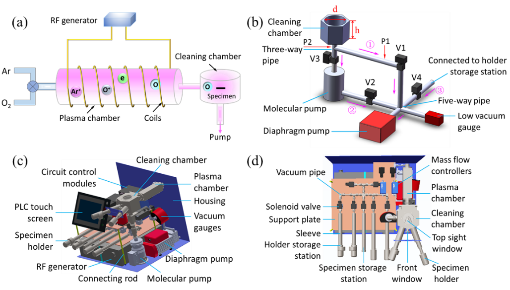 图 1(a)等离子体清洗系统工作原理图;(b-d)真空构件设计及装置三维模型